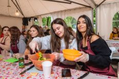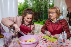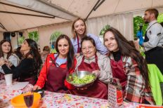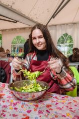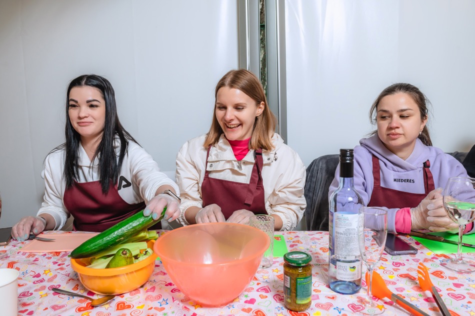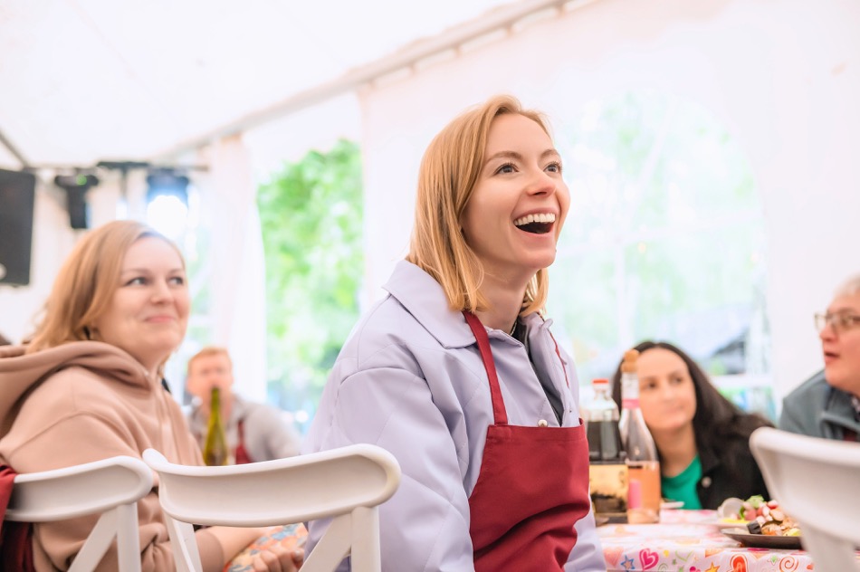 Праздник проходил на Шарташе, на базе отдыха «Мыс Рундук». Мы разделили 44 участника на две команды. Под руководством двух наших шефов – Вани Хромцова и Антона Константинова гости приготовили гриль-салат из овощей, с курицей и карамельной грушей, овощной итальянский салат с авокадо, водорослями чука, грушей и соусом из домашнего майонеза и песто, рулеты из куриного филе с беконом, форель в виноградных листьях. А потом команды объединились, чтобы собрать и украсить большой праздничный торт!