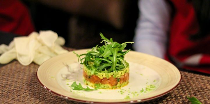Лосось слабосоленый, нарезать мелким кубиком, добавить мелко нарезанные каперсы, вяленые томаты, тимьян, розмарин, эстрагон, соль, перец черный (молотый), соевый соус, соус Свит Чили, соус Табаско. Хорошо все перемешать. На тарелку через форму выложить авокадо, сверху лосось с пряностями. Посыпать цедрой лайма. Гренки Бородинские выложить рядом с тар-таром. |
