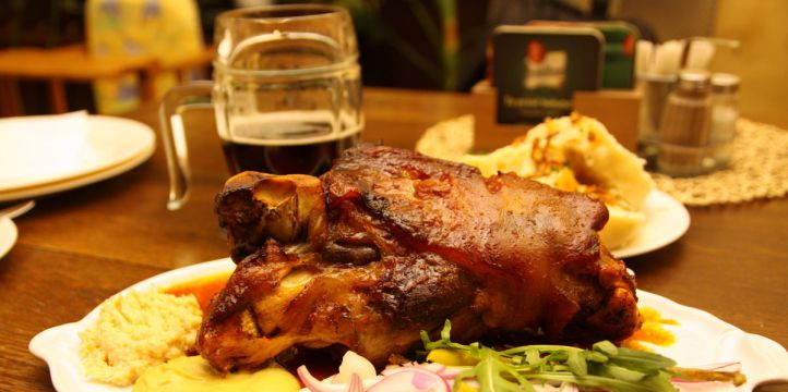 Подаем колено с квашеной капустой, свежими и маринованными овощами, зеленью, горчицей и тертым хреном.