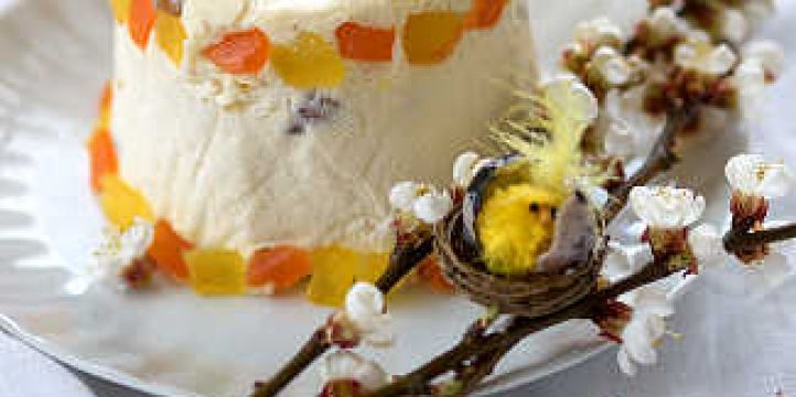 К остальным сливкам добавить сахар, довести до кипения, снять с огня. Влить в сотейник со сливками набухший желатин и размешать ложкой до полного растворения. Творог протереть через сито. Добавить к творогу сгущенное молоко тремя равными порциями, каждый раз вымешивая до однородности. Влить сливки с желатином, еще раз перемешать до однородности. Добавить цукаты. Полученную массу уложить в форму и поместить в холодильник до полного застывания на 1,5-2 часа. |