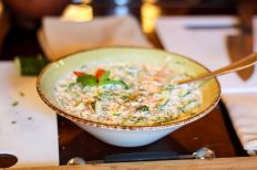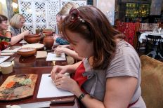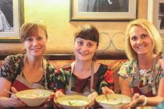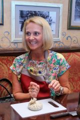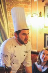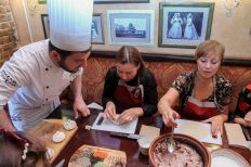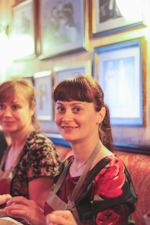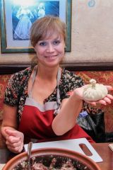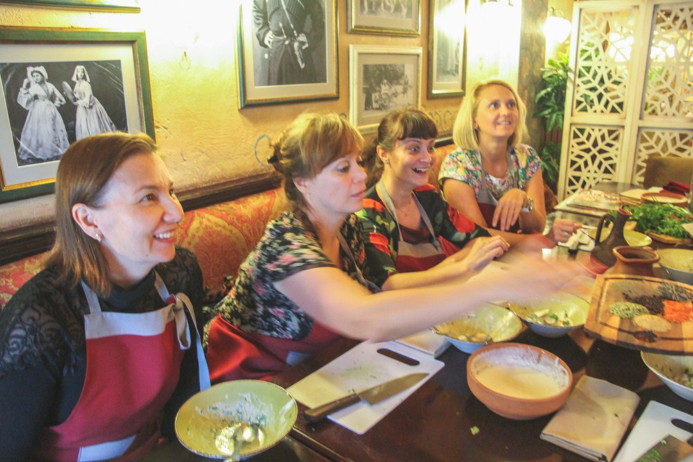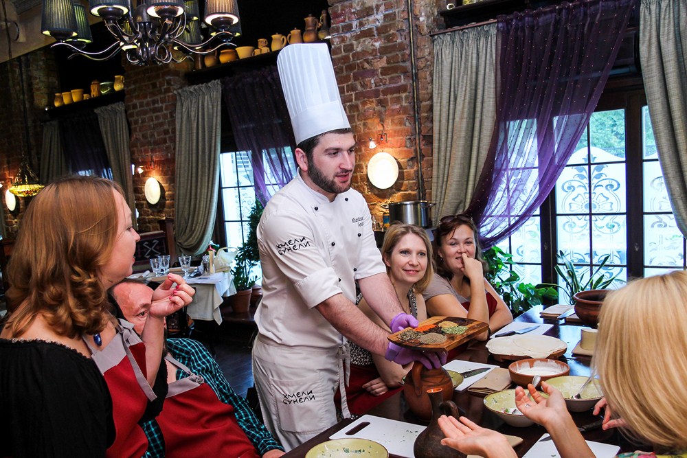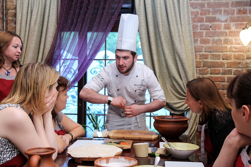Шеф-повар ресторана "Хмели-Сунели" Георг Хардзеишвили был неотразим: он учил нас готовить хинкали по-тбилисски по рецепту своей мамы и рассказывал такие секреты, без которых правильные хинкали просто не получатся. Также мы готовили чакапули - ароматнейшее блюдо из молодого барашка, припущенное с тархуном, соусом ткемали и белым вином, тончайшие кутабы с сыром и зеленью и освежающий супчик мацони с огурцами и мятой. Помимо этого, Георг много рассказывал о грузинских продуктах, специях, традициях, так что к финалу мы почувствовали себя будто бы в самом сердце гостеприимной Грузии!
