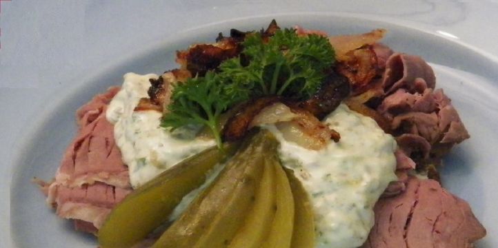 ![]() 1 кусок ржаного хлеба 10 г сливочного масла Готовый ростбиф Соус сливочный хрен или ремулад соленые или маринованные огурцы, микс-салат или руккола. Кусочек ржаного хлеба смазать сливочным маслом, на него уложить ломтики ростбифа (можете использовать любое запеченное мясо), на него выложить ложку сливочного хрена или соуса «ремулад», украсить кружочками огурца, и маленькой горкой микс-салата. Сливочный хрен можно взять готовый (хороший у Kuhne, например), либо смешать консервированный хрен с жирными сливками и взбить в блендере. Ремулад делается так: в хороший густой майонез по вкусу добавляется лимонный сок, дижонская горчица и рубленные каперсы либо корнишоны. Все хорошенько перемешивается. |