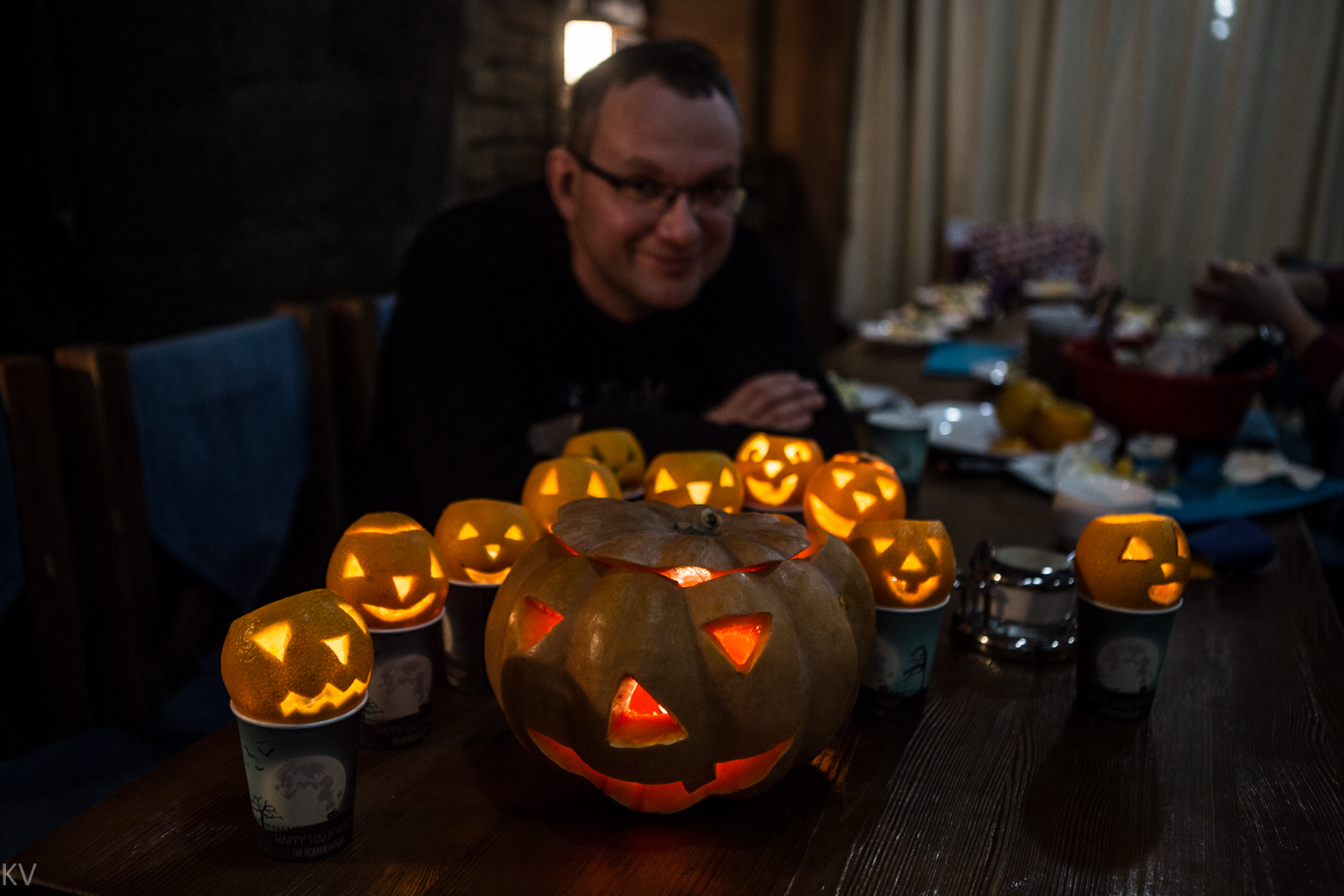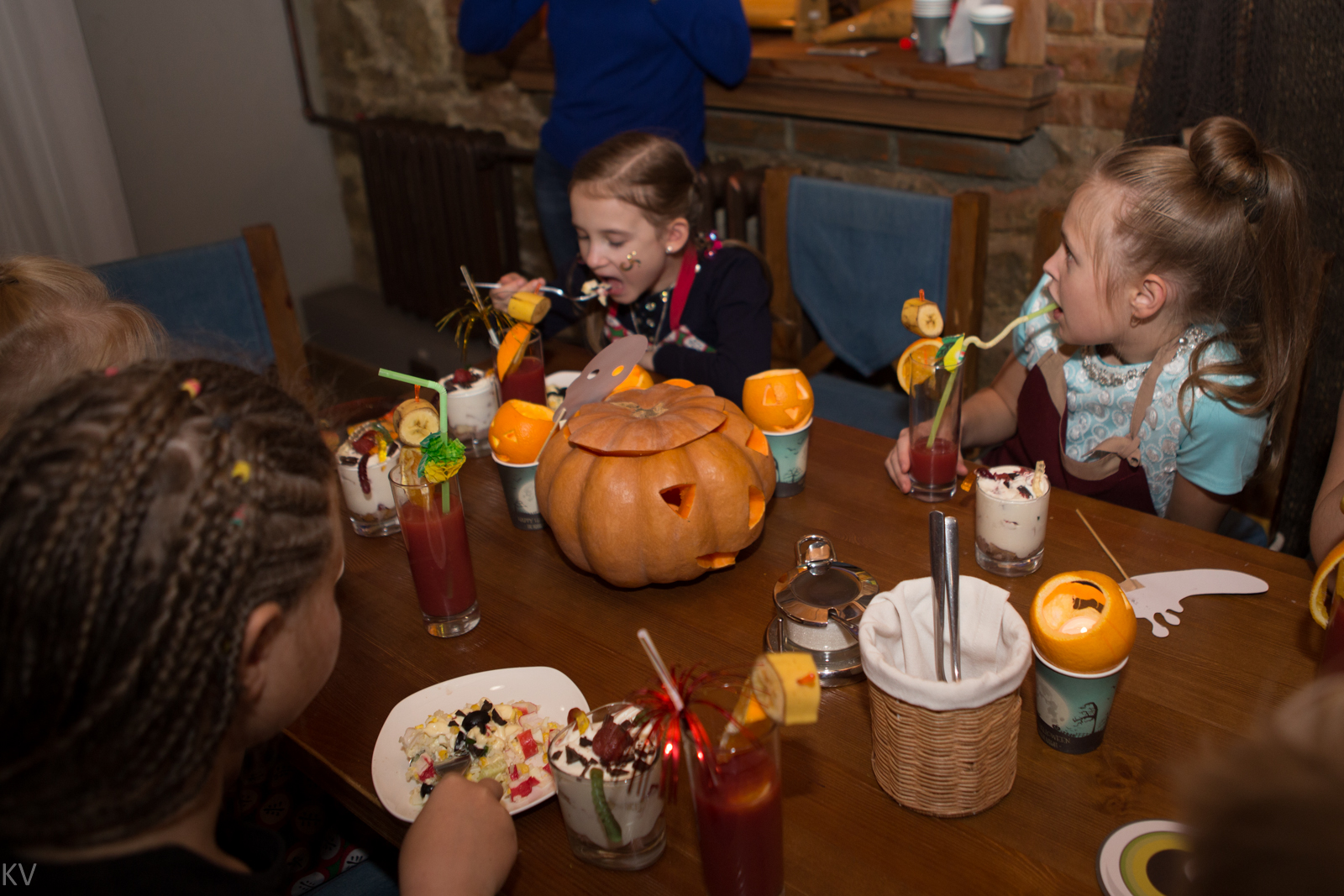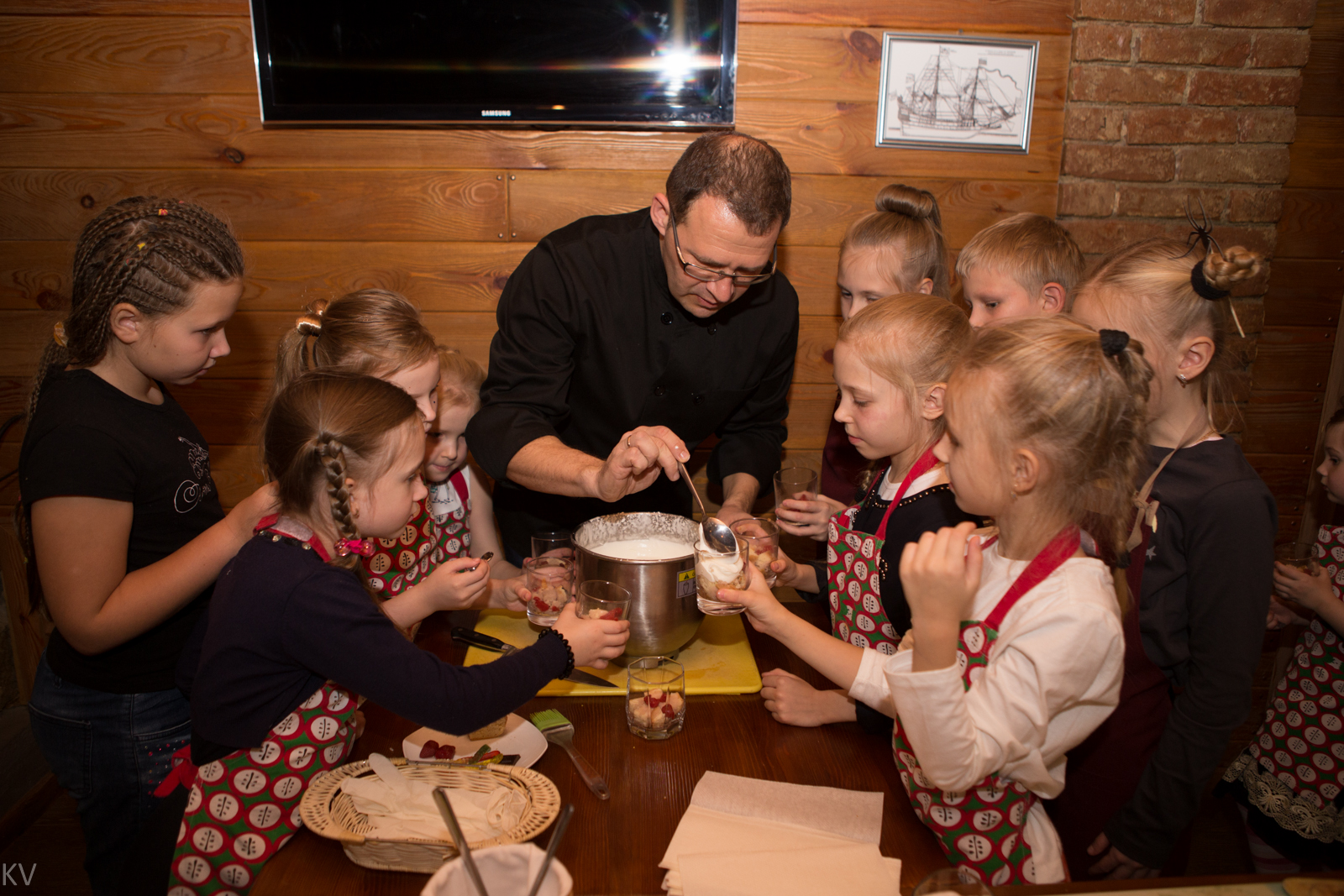 Замечательно отметили Хэллоуин в кафе-баре "Адмирал"! Пока дети под руководством мега-обаятельного шеф-повара Владимира Москалева готовили праздничное угощение - крабовый салат с паучками и паутинкой, сэндвичи-мумии, десерт с бисквитом, взбитыми сливками и мармеладными червячками, а также коктейль "Ведьмино зелье", родители тоже даром времени не теряли. Они занимались карвингом - вырезали из тыквы Джека-Фонаря и наделали маленьких фонариков из апельсинок. Словом, было весело и волшебно, и совсем не страшно. Разве что - страшно вкусно!