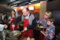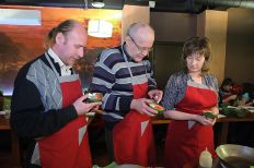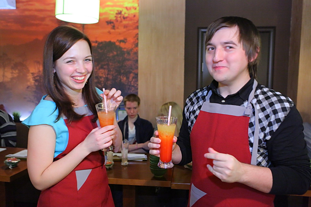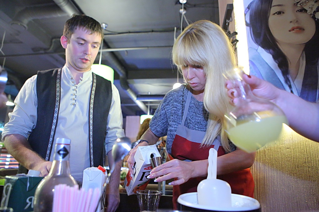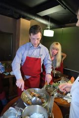 Бармен Дмитрий, чтобы участники почувствовали себя как на берегу Сиамского залива, научил нас готовить тропический коктейль «Май Тай». А затем началось настоящее погружение в мир неповторимых вкусов и ароматов Таиланда. Шеф-повар «AZИАТАЖ КАФЕ» Николай Дресвянкин научил нас готовить Том Кха Гай – родной брат знаменитого Том Яма, яркий и изысканный суп. Смешивая в воке невероятные специи – галангал, лемонграсс, каффрский лайм, соус нам пла, чили, кокосовое молоко, мы почувствовали себя настоящими алхимиками, когда получили тот самый неповторимый тайский аромат – пряный, сливочный, дразнящий! Потом мы приготовили хрустящие спринг-роллы с уткой – замечательный тайский перекус, а в финале «сочинили» в воке пряную лапшу Пад Тай с креветками, самое популярное блюдо тайских «макашниц». Николай – настоящий знаток азиатской кухни, с удовольствием делился с нами своими секретами: как самим сделать кисло-сладкий соус, как готовят утку по-пекински, какое масло выбрать для жарки спринг-роллов и наконец, где добыть все эти галангалы и лемонграссы в наших условиях. К концу вечера мы испытали настоящий «санук» и «сабай» по-тайски. Хотите тоже – присоединяйтесь!