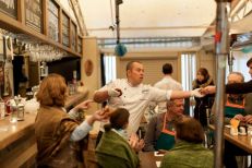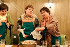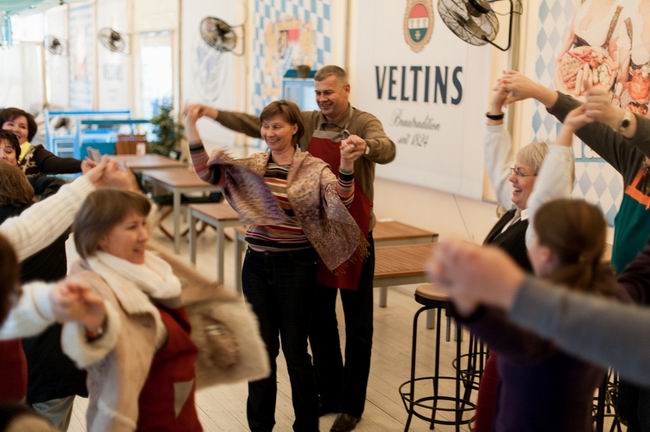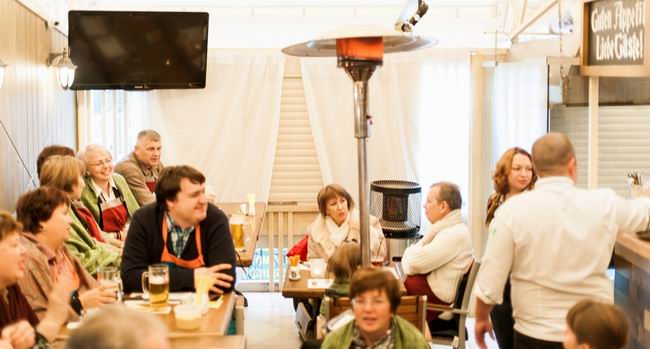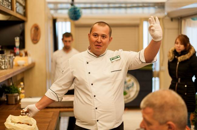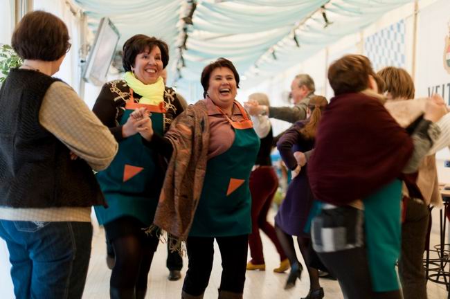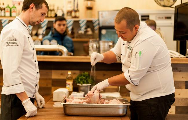 Решили так: пусть все будет, как в Германии - не будем прятаться в ресторане, а будем гулять, как немцы на Терезином лугу, в пивных шатрах. Благо, погода была не экстремально холодной, в шатре "Натюрлих!" от ресторана "Ратцкеллер" были тепловые пушки, мягкие пледы, согревающие напитки и активная программа. Для начала, после рюмочки фирменной настойки от "Ратцкеллера" шеф-повар ресторана Дмитрий Солонин устроил между командами рубиновых и изумрудных фартуков соревнование: кто быстрее налепит немецких кноделей и кто ловче замешает традиционный немецкий салат. Потом он устроил кулинарное шоу с приготовлением маринованных баварских цыплят на живом огне. Потом были пивные конкурсы и даже танцы - хореограф и руководитель Студии танца «Афалина» Наталья Балабанова закружила всех гостей в хороводе задорных баварских плясок. А потом подоспело горячее... Словом, мерзнуть на нашем уральском Октоберфесте было решительно некогда!