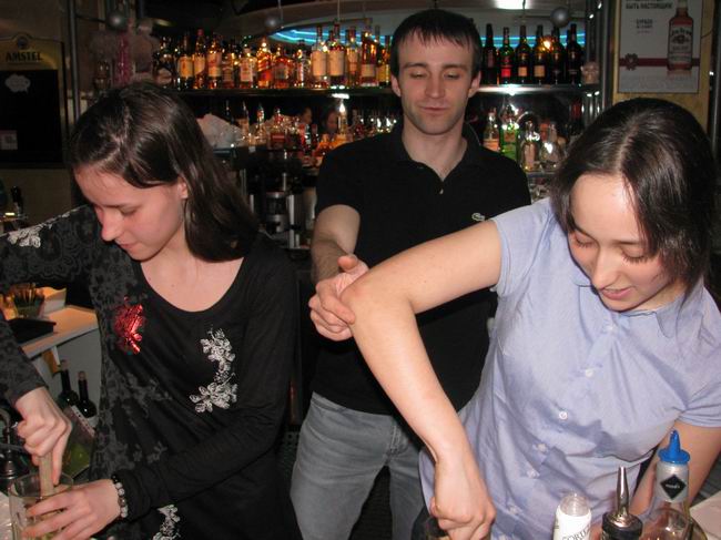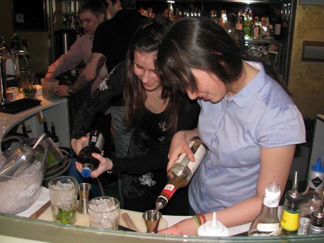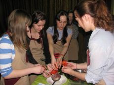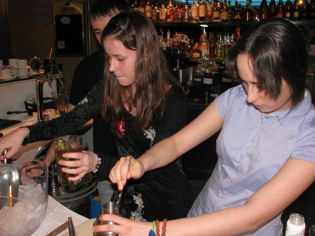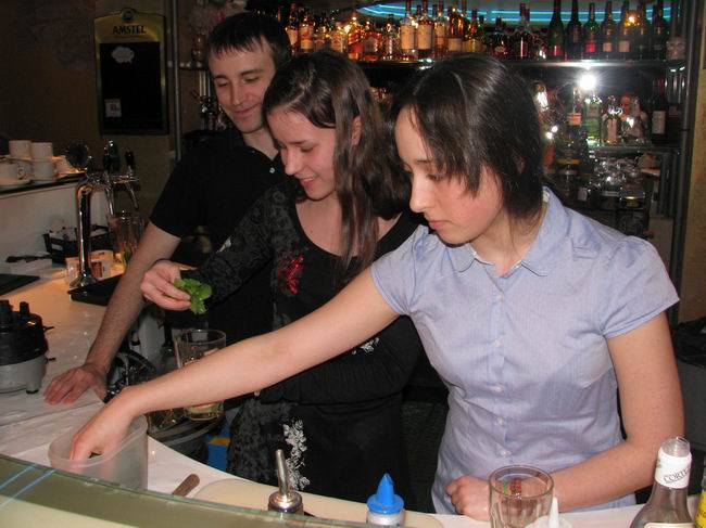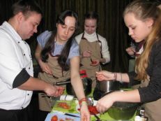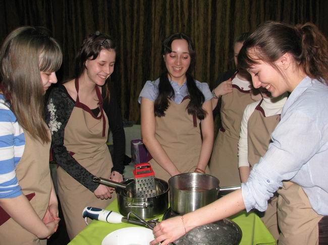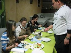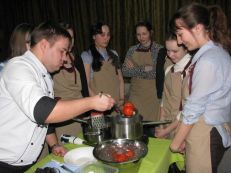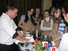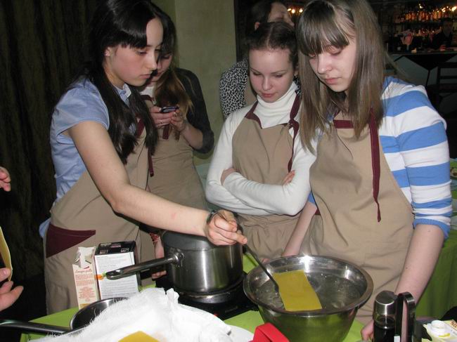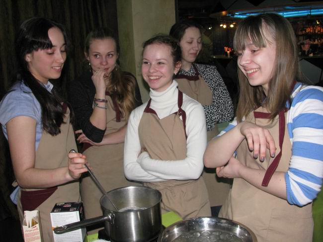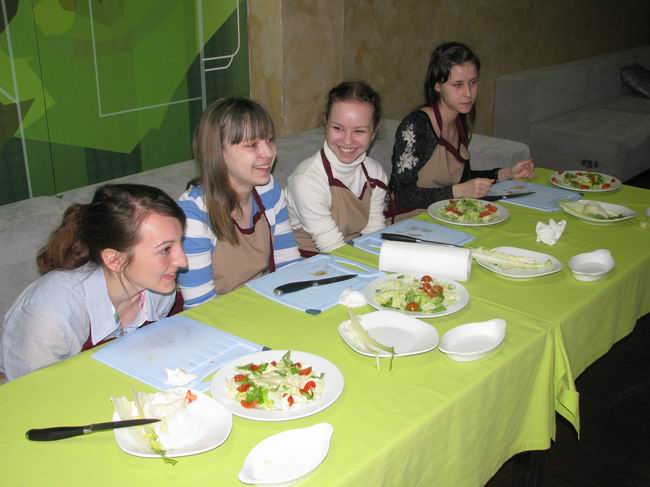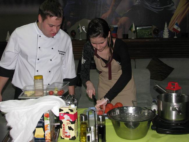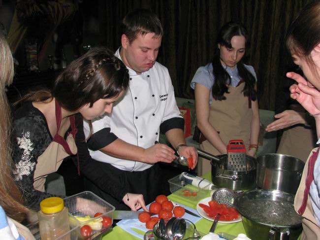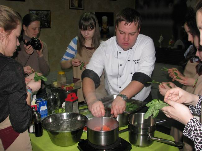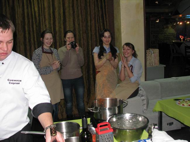 Меню мастер-класса было интернациональным: девушки приготовили американский салат Цезарь, итальянскую лазанью и кубинский коктейль «Мохито» (естественно, безалкогольную версию). Гости научились готовить знаменитый соус бешамель, научились делать канкасе и узнали, зачем оно нужно, а еще шеф-повар сверх программы продемонстрировал прием фламбе.